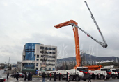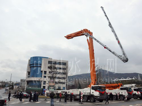 開至現(xiàn)場的碳纖維62米長臂架泵車引起眾人圍觀